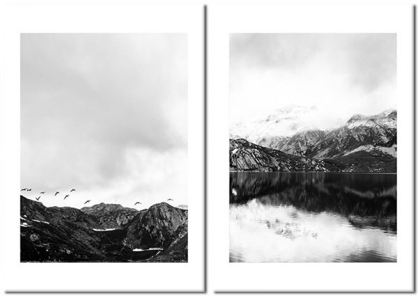Piękny dyptyk z motywem majestatycznego pejzażu. Dekoracja utrzymana w czarno-białej kolorystyce. Oryginalny obraz polecamy do upiększenia stylowego salonu.