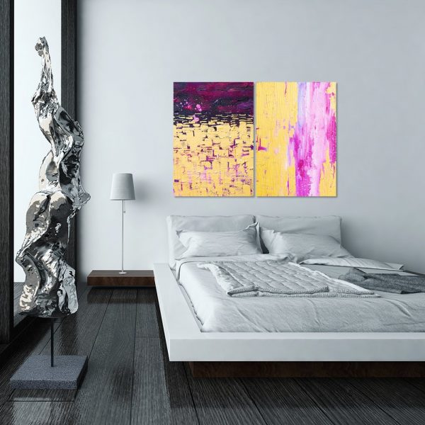 Oryginalny dyptyk przedstawiający abstrakcyjne bohomazy. Dekoracja w kolorach różowo-żółtych. Ozdobę polecamy do upiększenia ściany w sypialni.