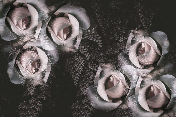 Zachwycająca tapeta z motywem pięknych róż i roślin. Dekoracja w stonowanej kolorystyce. Ozdoba idealnie będzie pasowała do salonu lub sypialni.