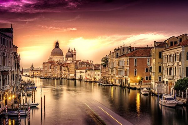 Śliczna tapeta z motywem Wenecji. Dekoracja utrzymania w ciepłych barwach kolorystycznych. Ozdoba idealnie będzie pasowała do salonu lub sypialni.