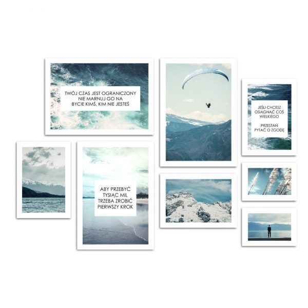 Oszałamiający zestaw plakatów z motywem spokojnych niebieskich motywów i sentencji motywacyjnych. Dekoracja w kolorze niebieskim z czarnymi napisami. Zestaw plakatów będzie ciekawą ozdobą ściany w sypialni.