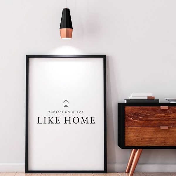 Genialny plakat z napisem: There’s no place like home. Dekoracja w czarno-białych kolorach. Ozdoba idealna do dekoracji ściany w Twoim salonie.