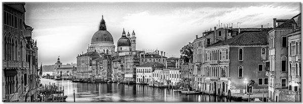 Cyfrowy obraz o podłużnym kształcie z pięknym Weneckim widokiem. Ozdoba utrzymana jest w odcieniach szarości. Obraz idealnie urozmaici ścianę w salonie.