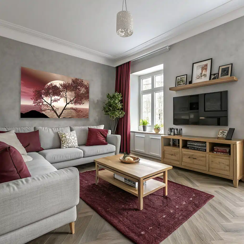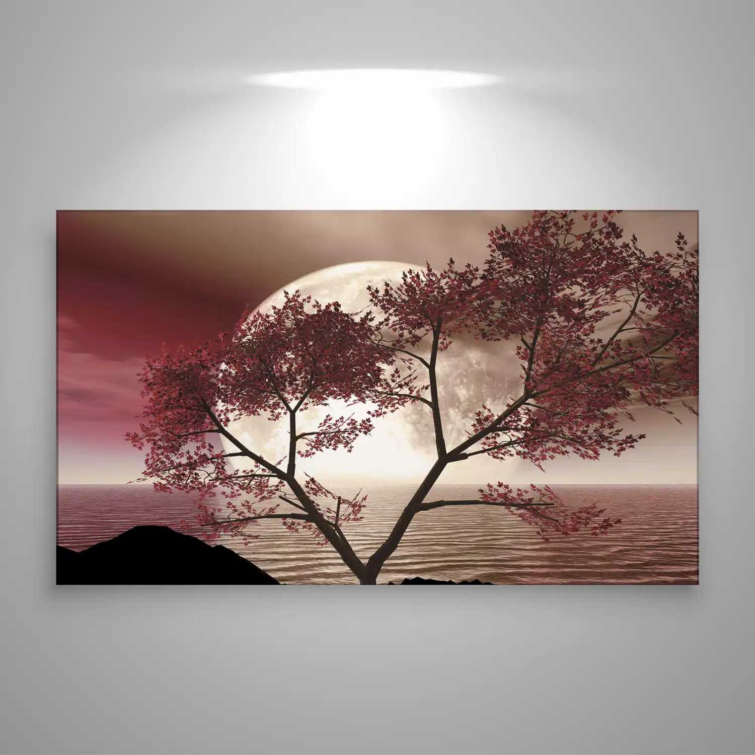 Wyobraź sobie spokojny wieczór. Zmierzch w odcieniach głębokiego burgundu i ciepłych sepii. Drzewo, które rozpościera swoje gałęzie jak symbol wytrwałości. I monumentalny księżyc, który przypomina, że piękno jest często tuż obok – trzeba tylko na nie spojrzeć.