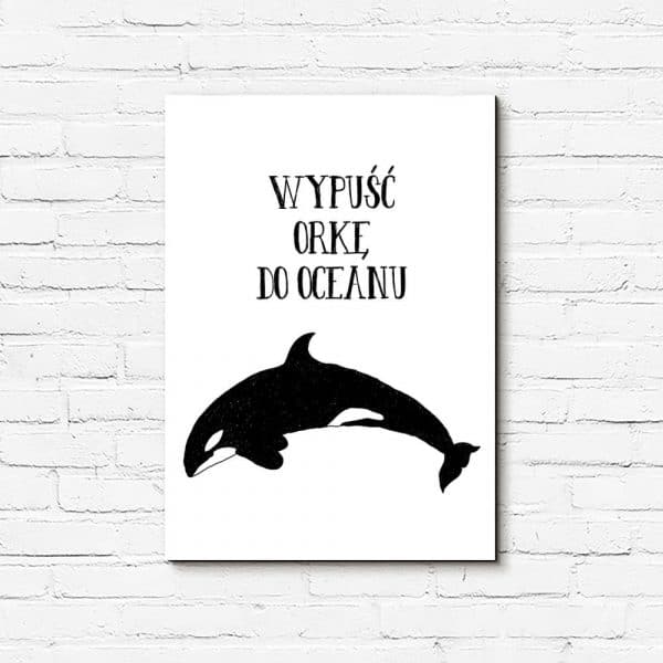 Niepowtarzalny obraz z humorystyczny napisem „Wypuść orkę do oceanu”. Dekoracja czarno-biała. Obraz sprawdzi się jako wspaniała ozdoba ścienna do toalety.