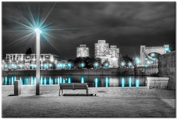 Nowoczesny obraz z miastem nocną porą. Dekoracja w czarno-białym z elementami turkusu. Obraz polecamy do ozdoby gabinetu lub biura.
