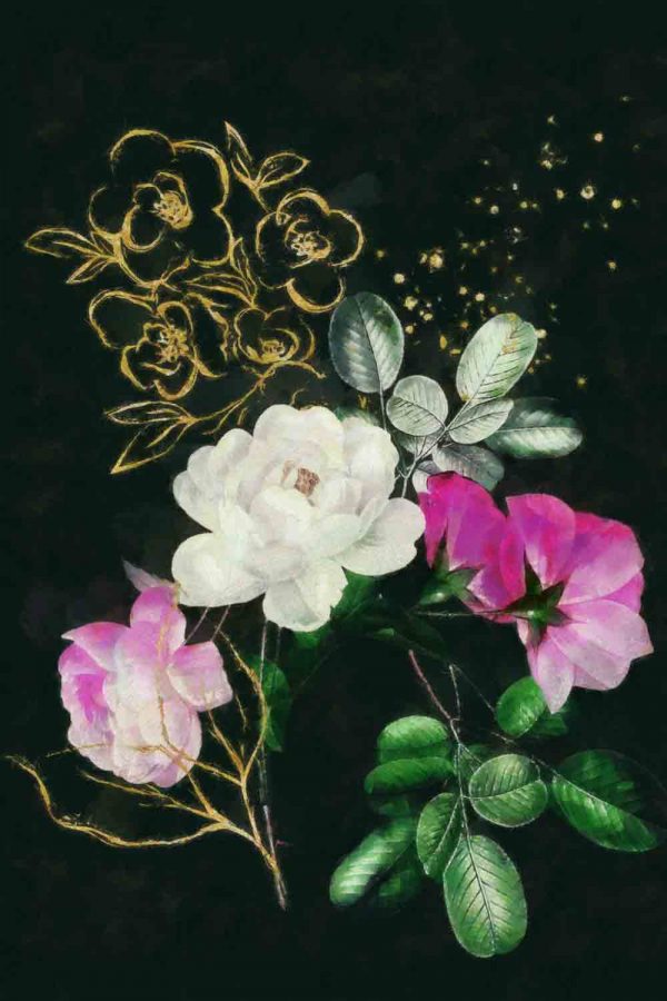Obraz z motywem pięknych róż. Dekoracja z dominującym czarnym tłem idealnie komponuje się z jasnymi kwiatami. Obraz będzie idealnym dodatkiem do sypialni oraz salonu.