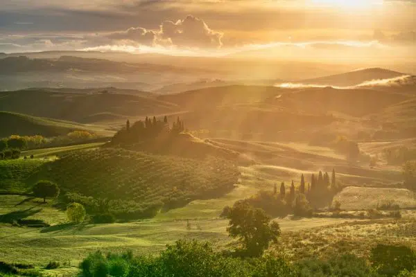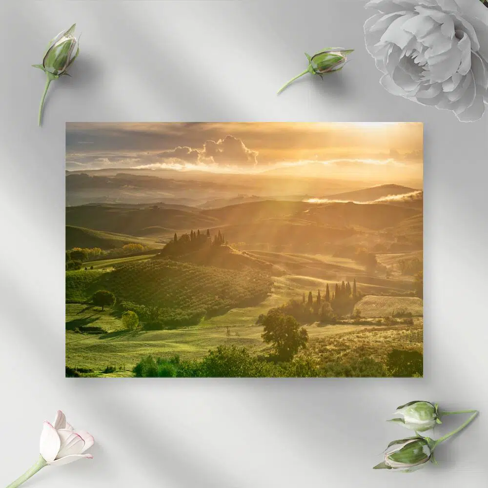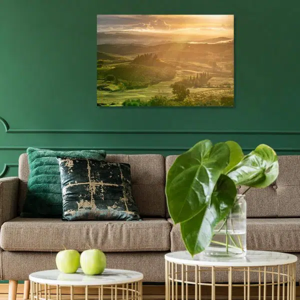 Dzieło z urokliwym widokiem na góry i polany. Ozdóbka w odcieniu zieleni. Obrazeczek pięknie wypełni Twoją sypialnie.