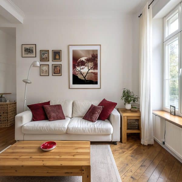 Nie wszystko, co piękne, musi być krzykliwe. Czasami wystarczy jeden kolor, który wypełnia wnętrze spokojem i szczyptą teatralnego nastroju. Ten plakat to hołd dla ciepłych tonów – burgundu i sepii, które razem tworzą obraz trochę jak wspomnienie, trochę jak obietnica.