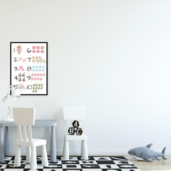 Genialny plakat przedstawiający cyfry oraz ich ilościowe odpowiedniki. Ozdobę polecamy do powieszenia w przedszkolu.
