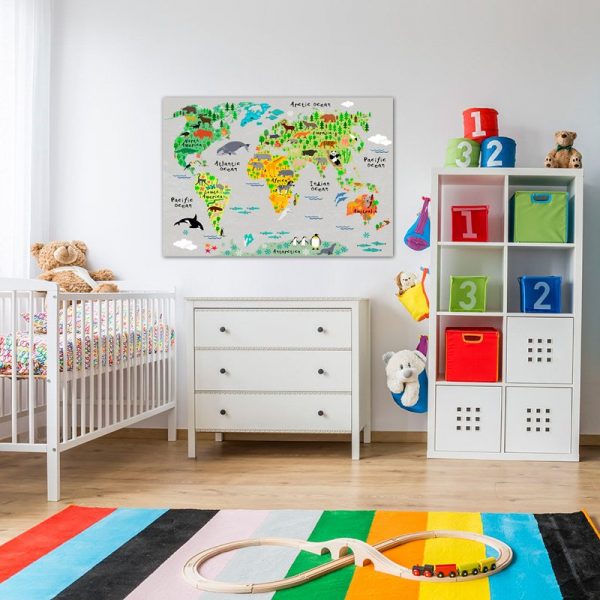 Fantastyczny plakat z mapą świata i zwierzątkami. Dekoracja w wyrazistych kolorach. Grafika będzie świetną ozdobą na ścianie w pokoju chłopca lub dziewczynki.
