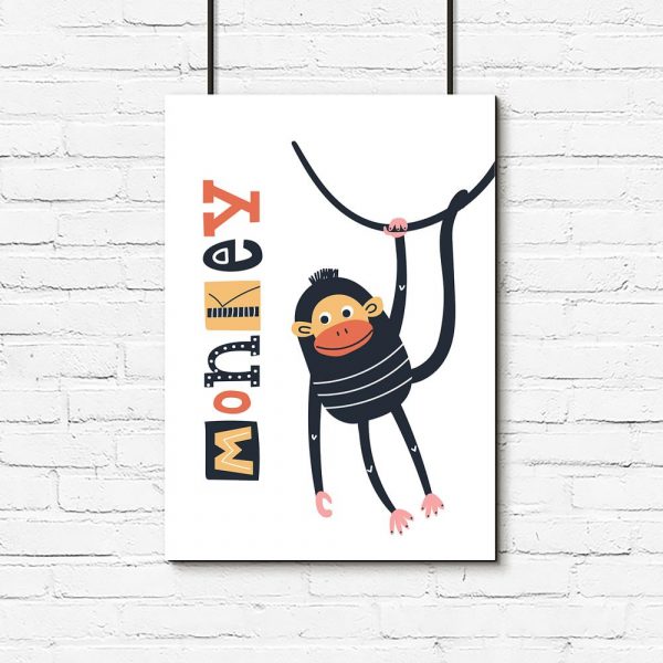 Uroczy plakat przedstawiający wiszącą małpkę i napis po angielsku „Monkey”. Grafika jest wielobarwna. Plakat będzie wspaniałą ozdobą ściany w pokoju dziecka.