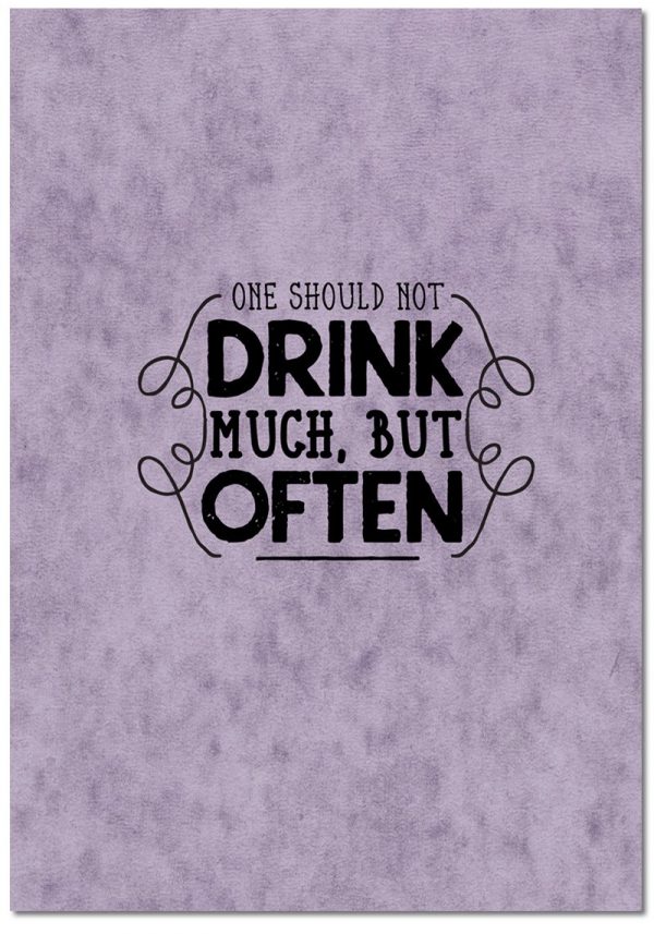 Nowoczesny plakat z zabawnym angielskim napisem: one should not drink much, but often. Dekoracja w kolorze fioletowym. Grafika będzie oryginalną ozdobą stylowego salonu lub jadalni.
