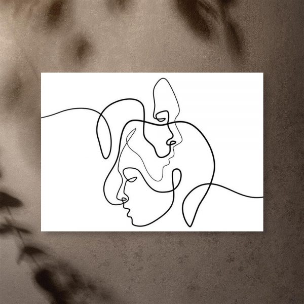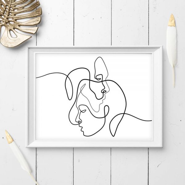 Ascetyczny plakat przedstawiający szkic twarzy kobiety i mężczyzny. Ozdobę polecamy do dekoracji salonu.