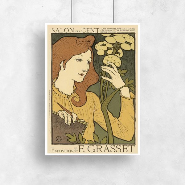 Oryginalny plakat w stylu vintage przedstawiający kobietę z książką, trzymającą roślinę. Dekoracja w kolorze żółto-brązowym. Idealna ozdoba salonu oraz sypialni.