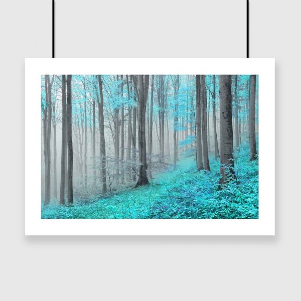 Przepiękny plakat przedstawiający las. Ozdoba w kolorze turkusowym. Plakat polecamy do upiększenia salonu.