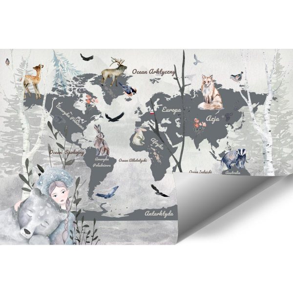 Urzekająca tapeta przedstawiająca kontynenty oraz zwierzęta żyjące na nich. Ozdobę proponujemy do dekoracji sali w przedszkolu.